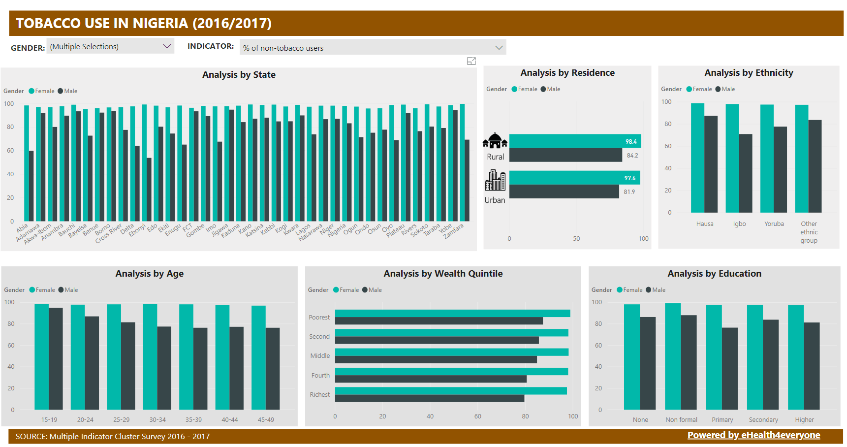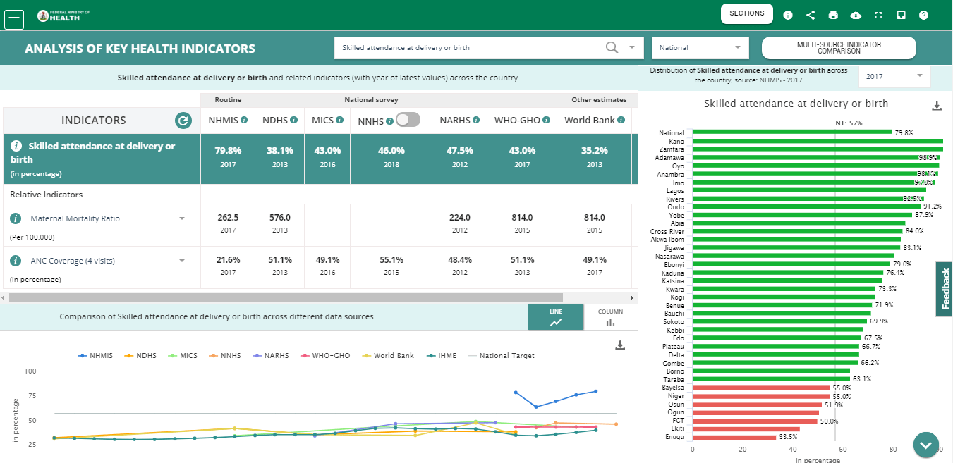 This dashboard provides a single transparent view of data from states across the country. It presents health data across six (6) program areas: RMNCH, Malaria, Immunization, HIV/AIDS, Tuberculosis and Mortality. It also presents Health Facility Survey data for each state.